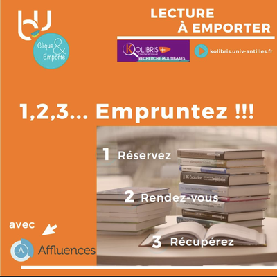 Rendez-vous sur Affluences à partir du mel qui vous sera envoyé. Vous pourrez ainsi choisir un créneau horaire qui vous permettra de récupérer les documents réservés dans l'une des bibliothèques suivantes : BU du Campus de Schoelcher, BU du Campus de Fouillole, BU du Campus du Camp Jacob, BU du Morne Ferret (INSPE de Guadeloupe), BU de Fort-de-France (INSPE de Martinique). C'est vous qui choisissez votre bibliothèque de retrait !!!